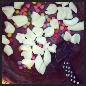 Baka en smarrig kladdkaka med marschmallows och nonstop.